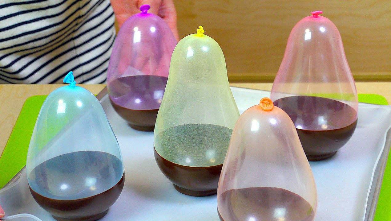 Надуйте воздушные шарики, вымойте с мылом. Растопите шоколад и окуните шарики в теплую сладкую массу. Подождите, пока шоколад застынет и аккуратно лопните шары.