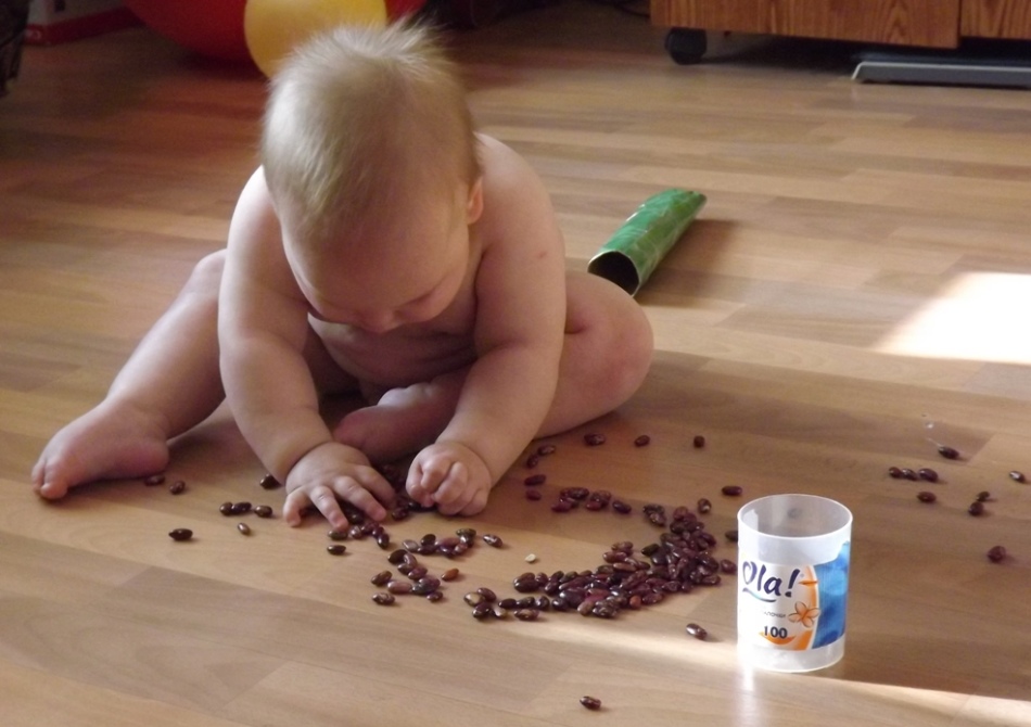 - Если кроха уже умеет сидеть, можно поиграть с ним в песочницу. Только вместо песка можно использовать разнообразные крупы. Такие игры должны проводиться под строгим контролем родителей, так как ребенок в любом случае попытается попробовать то, что ему дали, на вкус