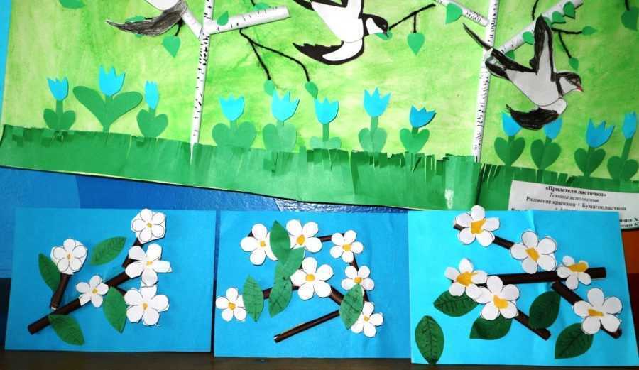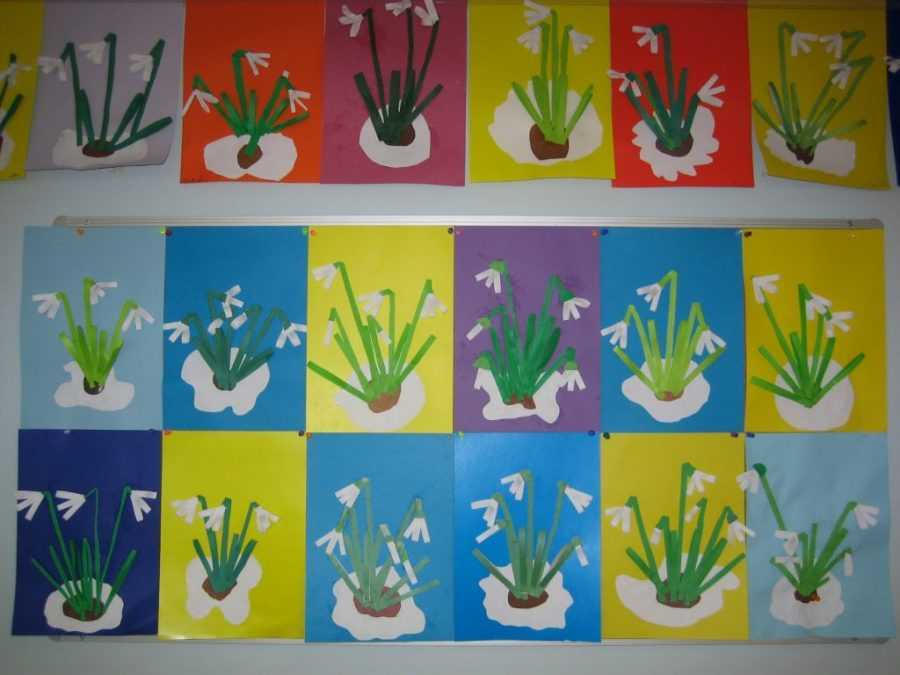 Лепестки цветков белого цвета сначала рисуем на бумаге, вырезаем и подгибаем края. На один цветок — 5 лепестков. В центр цветка помещаем шарик из пластилина желтого цвета; он скрепляет всю конструкцию.