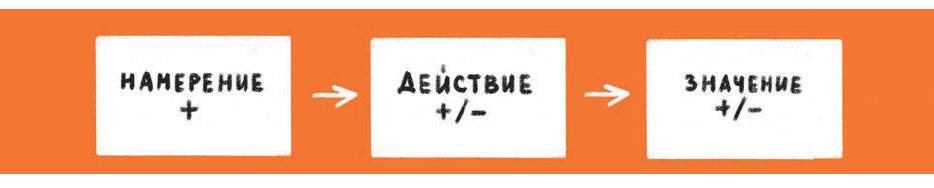 Например, ты задержался и не позвонил, потому что телефон разрядился. Из-за этого дома был скандал (действие), и ты тоже разозлился (значение). Но реагировать надо было на намерение: мама боялась, что с тобой случилось что-то плохое, а она не может помочь, ведь даже не знает, где ты.