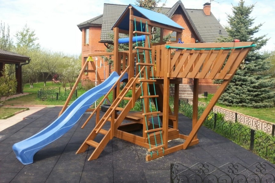 Покрытие из резины долговечное, износостойкое и имеет большой выбор цветов. Также материал не токсичен и гипоаллергенен. Покрытие хорошо смягчает удары. Резиновая детская площадка – отличный выбор для дачи.