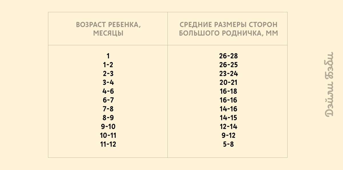 Сами определения «маленький» и «большой» условны по отношению к родничку. Узнать, каким он должен быть в норме, можно ориентируясь на очень приблизительные цифры, которые приведены в таблице. Чтобы измерить родничок, возьмите сантиметровую ленту и посмотрите расстояние между противоположными сторонами «ромба».