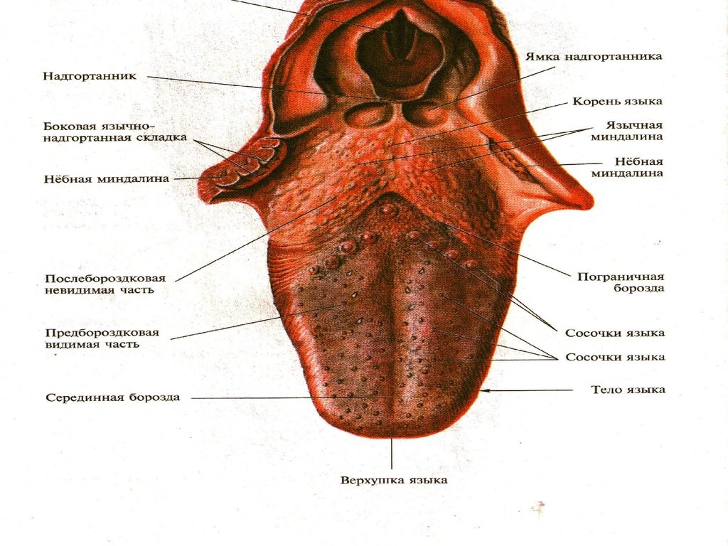 Тело языка состоит из поперечнополосатой мышечной ткани, которую покрывает оболочка слизистой ткани. Его поверхность, которая называется спинкой, условно делят на три части: