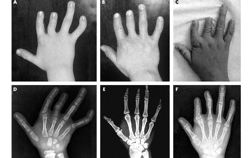 3) Тип С, когда мы замечаем недоразвитие пястных костей, средних фаланг пальцев. У детей, страдающих данной патологией наблюдались низкий рост и торможение в умственном развитии;