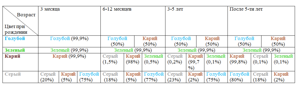 Ученые создали специальную таблицу, которая дает возможность родителям определить, глаза какого цвета будут у их ребенка. С ее помощью можно предсказать, как меняется исходный цвет к годовалому возрасту. Серые глаза при рождении могут поменять свой оттенок со светлого на темный, голубые глаза новорожденного могут немного потемнеть и стать красивого небесного оттенка либо более светлыми. Зеленые глаза при рождении становятся впоследствии светло-карими или голубовато-зелеными. Если генетически у ребенка заложен карий цвет глаз, то малыш родится с темно-серой радужной оболочкой.