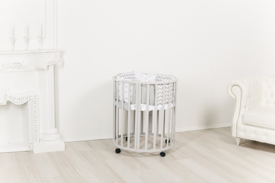 Когда кровать круглая для новорожденных растет вслед за своим хозяином, она становится овальной. Между двумя полукругами вставляются удлиняющие бортики, добавляются новые рейки на дно, и кладется новый матрас – спальное ложе для ребенка постарше готово. Причем в этот момент можно опустить дно чуть ниже, чтобы малыш, который учится садиться, не смог вывалиться.