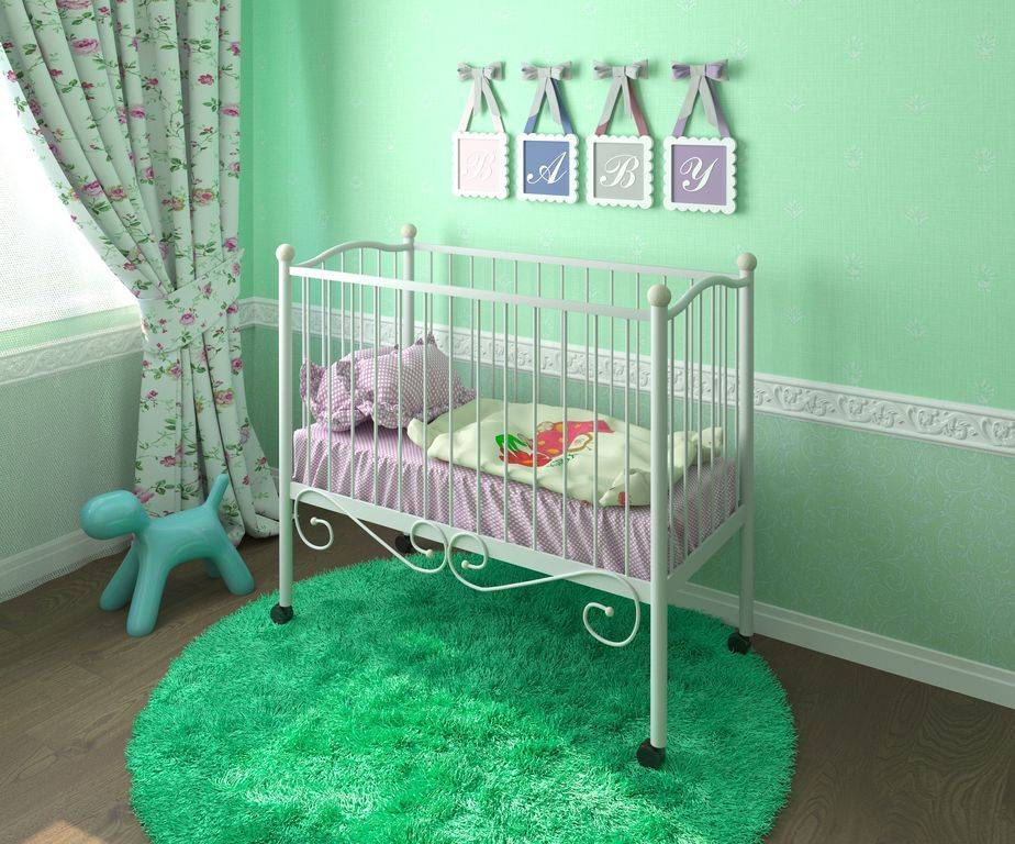 Металл – тоже безвредный материал. Очень прочный и долговечный. Есть недостаток – он холодный. Еще учитывайте, что удариться об металл и дерево, разные вещи. В такую кроватку нужны мягкие бортики.