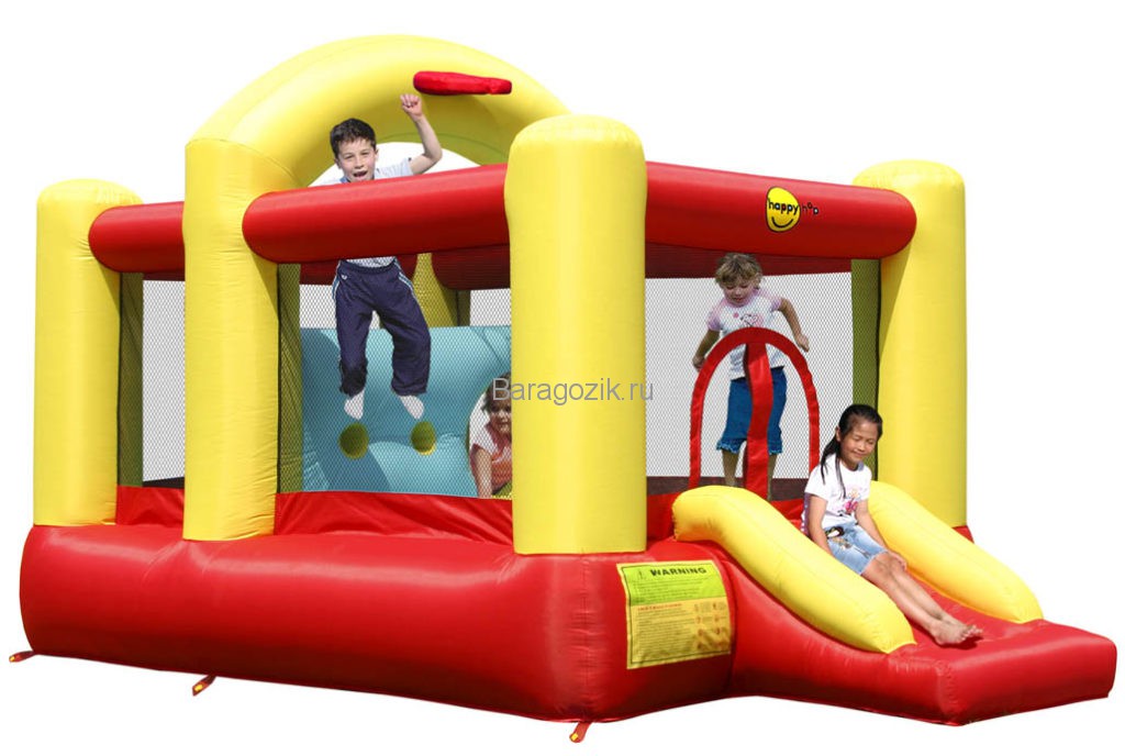 Комплекс изготовлен из плотного ПВХ и состоит из прыгучей секции, надувной горки, туннеля и сухого бассейна с разноцветными шариками. Изделие имеет ступеньки, бортики и выдерживает диапазон температур от – 10 до + 40 °C. Размеры горки 256×87 см. Разрешенная нагрузка 181 кг. В игровой зоне могут одновременно находиться четыре ребенка.