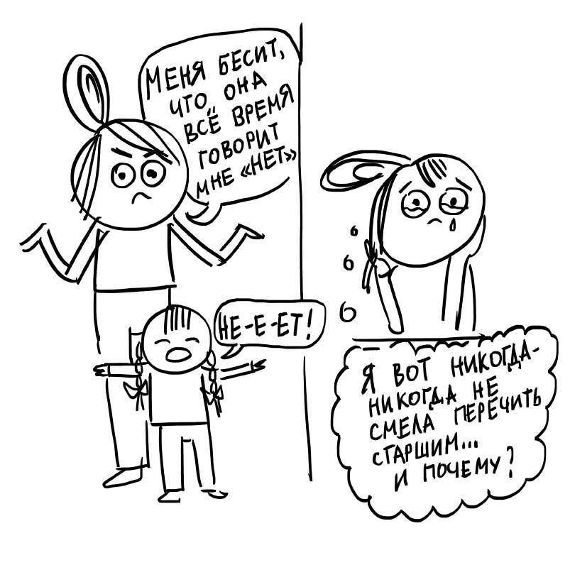 — Меня бесит, когда дочь говорит “нет”. Мне даже кажется, что она на все говорит “нет”. Иди есть — нет. Иди спать — нет. Одевайся — нет. Ей всего-то пять лет, а она мне, своей маме, говорит “нет”! Разве можно маме говорить “нет”?!