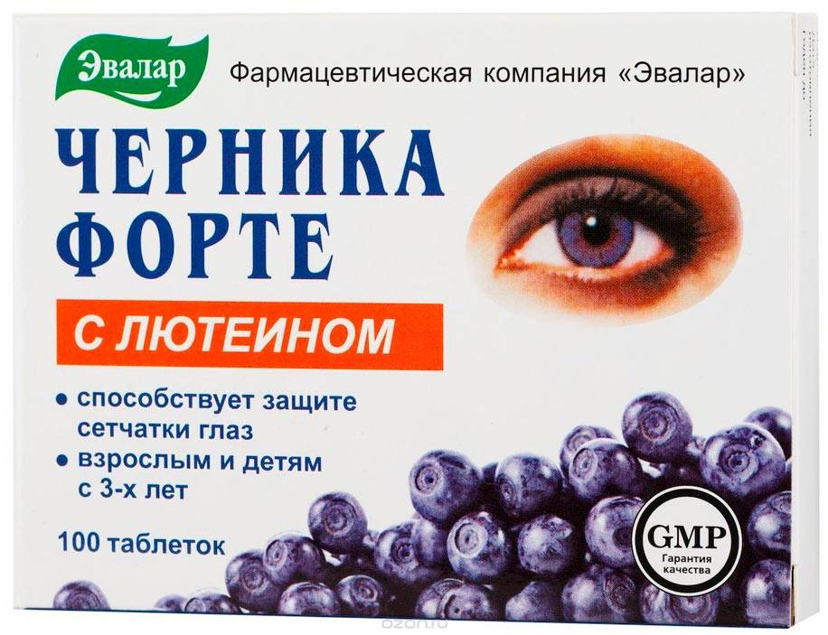 «Черника Форте» от «Эвалар». В состав препарата входит черника, которая улучшает сумеречное зрение. Также данное средство помогает устранить признаки астенопии.