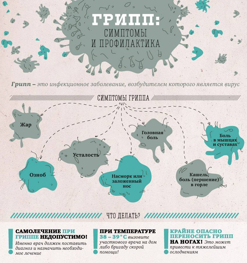 Сезонный грипп передается легко и может быстро распространяться в школах, домах престарелых и инвалидов, на предприятиях и в городах. Когда инфицированный человек кашляет, зараженные вирусом капельки попадают в воздух. Их может вдохнуть другой человек и подвергнуться воздействию вируса. Грипп может также передаваться через руки, инфицированные вирусом. Период между инфицированием и заболеванием, известный как инкубационный период, длится около двух дней. Для сезонного гриппа характерны симптомы в виде внезапного появления высокой температуры (38 C – 40 C), кашля (обычно сухого, напряжённого, сопровождающегося болью за грудиной), головной и мышечной болью, болью в суставах, сильного недомогания (плохого самочувствия), болью в горле. Насморка, как правило, нет. Большинство людей выздоравливает в течение недели без какой-либо медицинской помощи. Но грипп может приводить к развитию осложнений или смерти у людей из групп повышенного риска.