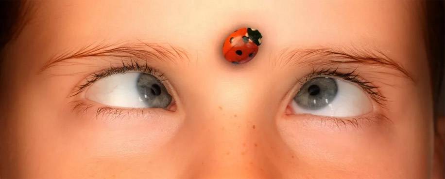 Медленно и глубоко вдыхая, ребенок смотрит вверх, по направлению к области между бровями, задерживая глаза в таком положении на пару секунд. Медленно выдыхая, он возвращает их в начальное положение и закрывает на несколько секунд. С течением времени задержку в верхнем положении можно увеличить. Требуется 3-5 повторений.