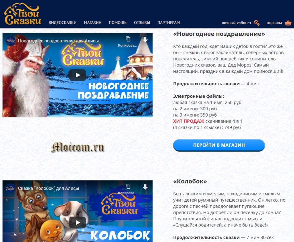 На сайте твои сказки ком представлены 4 популярные видео сказки — новогоднее поздравление, колобок, теремок и лубяная избушка. При скачивании всех четырех сказок по одной ссылке цена будет 749 рублей. Скачивание каждой видео сказок по отдельности от 250 рублей и выше. Эти мультяшные сказки как нельзя лучше подойдут и будут оценены самыми маленькими нашими зрителями до 7 лет.