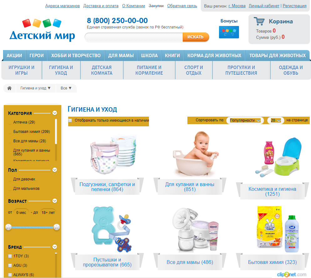 Блок разделён на разделы для малыша и мамы. В этой категории расположены приспособления для кормления ребёнка, средства и вспомогательные изделия для купания, а также бытовая химия, которую можно использовать для ухода за одеждой.