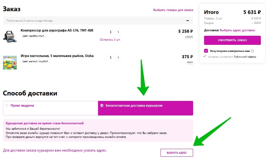 С начала введения карантинных мер на территории России администрация компании ввела режим бесконтактной доставки. Покупателям, которые решились воспользоваться такой услугой, потребуется на сайте выбрать эту опцию в разделе на странице «Доставка».