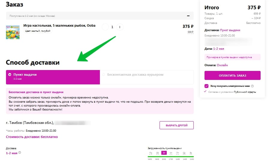 Для выполнения заказа пользователь вводит в «Адрес доставки» наименование необходимого города. На сайте в автоматическом режиме отобразится список подходящих мест самовывоза, где возможно будет получить товар.