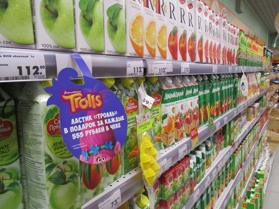 Например, сейчас в “Пятёрочке” проходит акция “Тролли на воле”. За каждый 555 рублей в чеке приятный подарок — маленькая цветная фигурка тролля в форме ластика. Если включить в свой список товары, участвующие в акции (обычно такие отмечены на полках магазина специальными стопперами), то получим ещё больше подарков. Дети довольны, и родителям удобно. Приходишь в ближайший к дому магазин, покупаешь, как и раньше то, что необходимо, и получаешь в подарок волшебную фигурку и море детской радости вместо обычных капризов. Причём эти тролли одинаково нравятся и маленькой дочке, и сыну-четверокласснику — так как это ластики, то дочка с ними рисует, а сын пользуется на уроках в школе.