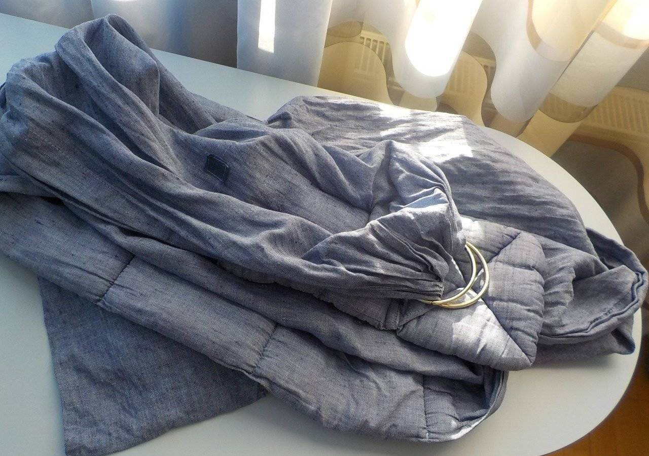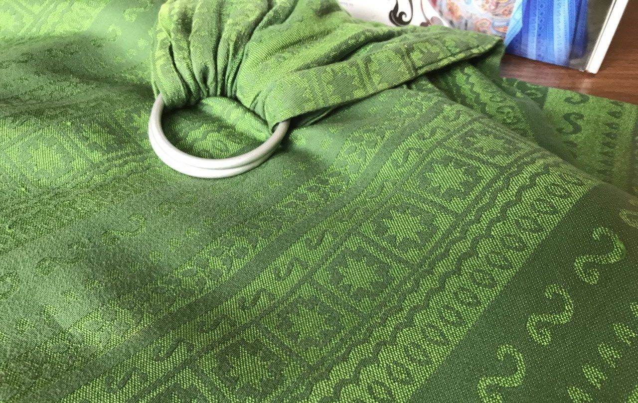 Это полоса ткани длиной порядка 2 метров и шириной около 70 см. На одном конце располагаются мягкая подкладка под плечо и кольца, а другой конец слинга заправляют в кольца таким образом, чтобы можно было регулировать размер слинга.