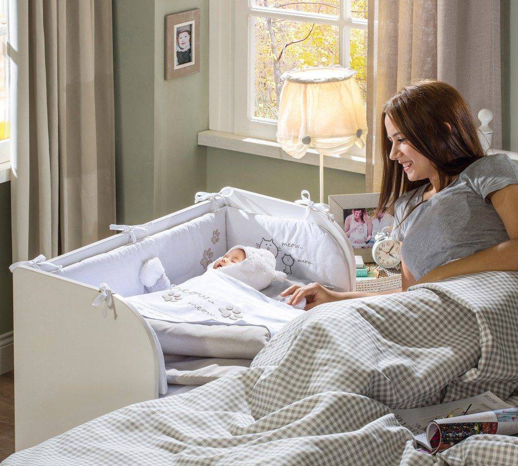 - Правильно будет приучить ребенка спать в собственной кроватке. Для удобства поставьте ее рядом со своей кроватью, сняв боковой борт. Так не нужно будет вставать ночью, достаточно лишь приподняться и достать кроху из кроватки. Да и малыш будет спать спокойнее, слыша рядом спокойное дыхание родителей.