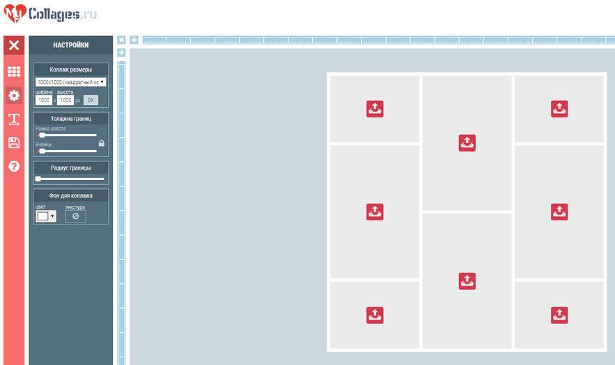 - Открыв в браузере сайт Mycollages.ru, нажимаем «Создать коллаж». Появляется окошко со стандартным шаблоном. Панель слева отвечает за параметры, редактирование, скачивание и сохранение готовой картинки. Справа прикручены кнопки социальных сетей – чтобы опубликовать работу на своей страничке, достаточно одного клика.