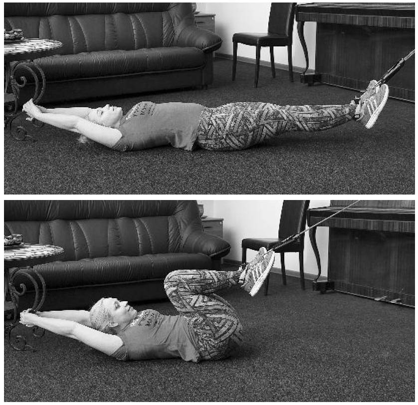 И.П. лежа на полу, держась вытянутыми руками за НОП. Одновременная тяга к животу бедрами тренажера, прикрепленного одним концом к нижней трети голеней, другим — к верхней точке НОП. Выполнить не менее 20 повторений