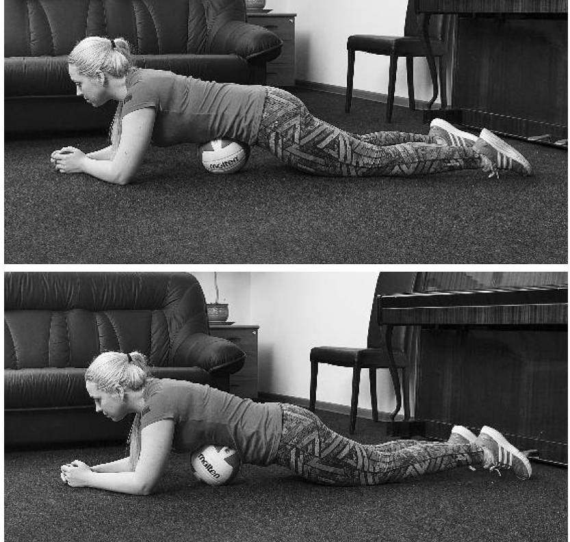 И.П. лежа на полу. Под живот положите мяч (баскетбольный, футбольный, волейбольный). Перекатывайтесь на мяче по часовой стрелке (справа налево, снизу вверх), то есть по всей поверхности живота — 5–10 кругов. Утром или вечером, обязательно натощак, предварительно выпив не менее стакана воды.