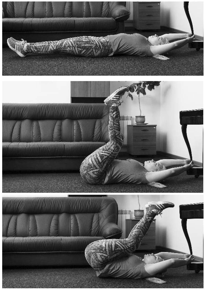 И.П. лежа на спине, прямыми руками держась за неподвижную опору. Поднимание ног (прямых или слегка согнутых в коленях) до уровня 90о и больше (к полу), стараясь коснуться стопами неподвижной опоры. Желательно при опускании ног пятками пола не касаться.