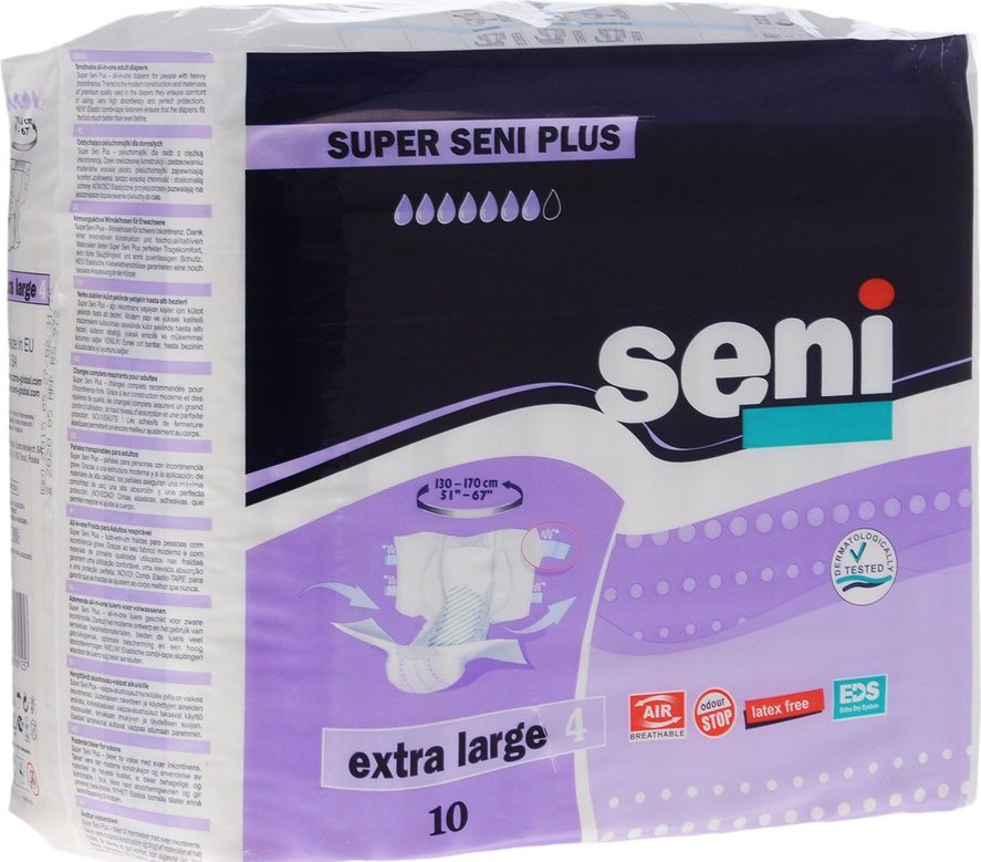 «Seni» (Польша) – самые распространенные подгузники для взрослых. Их можно приобрести в любой аптеке и крупном супермаркете. Благодаря широкому размерному ряду и нескольким категориям впитываемости, подгузники подходят для использования в крайне тяжелых случаях (при высокой степени недержания, в ночное время суток, для тех, кто принимает диуретические медикаменты). Все выпускаемые производителем серии подгузников выполнены из «дышащих» материалов, имеют бортики, эластичные резинки на бедрах и надежный анатомический пояс.
