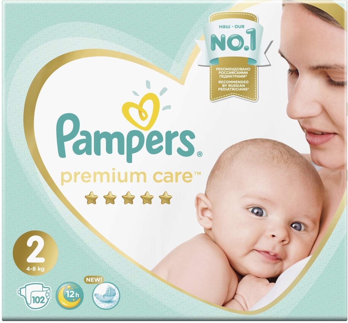 - Pampers Premium Care 2 (4-8 кг) – подходит новорожденным с первых дней жизни;
