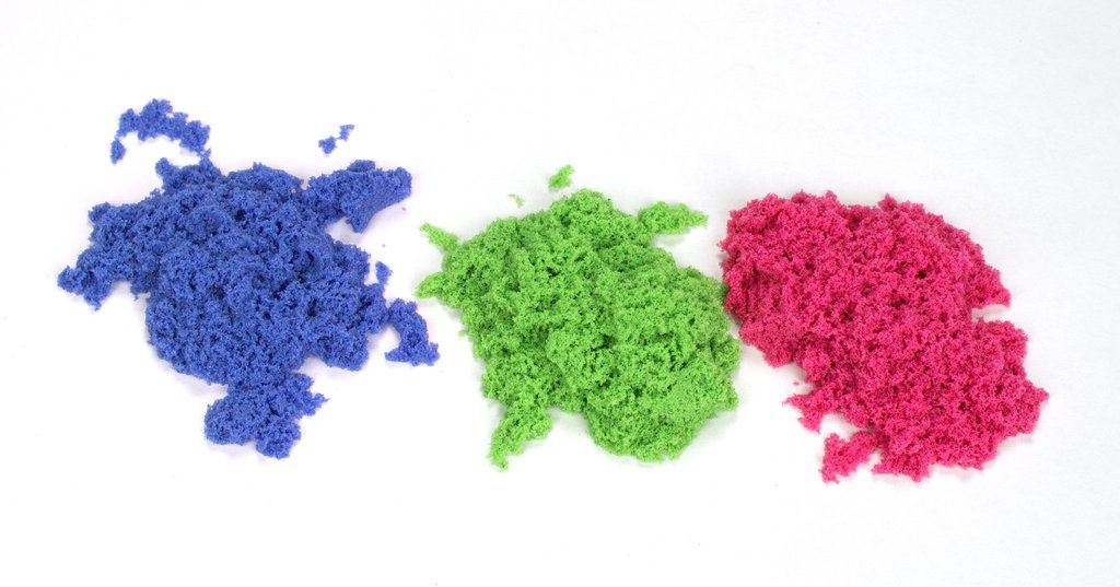 - бывает различной окраски: натуральной, белой, розовой, синей и другой. А также выпускается мерцающий Kinetic Sand. Элементы такого песка — блестящие частички, напоминающие алмазы;