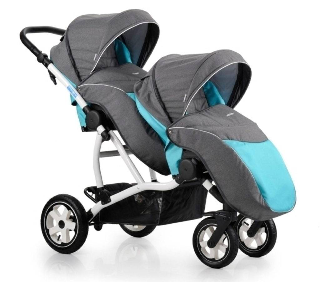 В этом случае прогулочные кресла или люльки располагаются на раме друг за другом. Такие конструкции вытянуты в длину, ширина же сопоставима с одноместными аналогами. Можно подобрать вариант с расположением кресел лицом друг к другу, спиной друг к другу или друг за другом. При этом некоторые производители предлагают как одно- так и двухуровневые рамы, когда один блок крепится выше или ниже другого.
