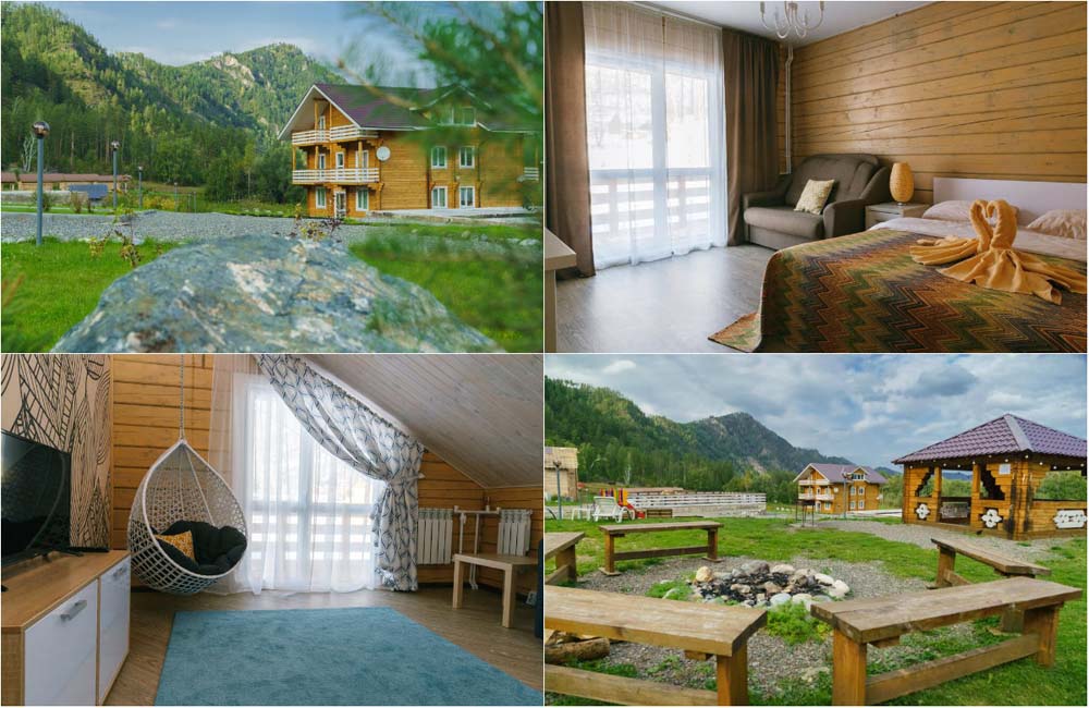 Круглогодичная база отдыха расположена в сосновом лесу на берегу реки Катунь. Рядом — деревня, горнолыжная трасса и канатная дорога. Большие корпуса из дерева и камня, красивая и ухоженная территория, зона барбекю, открытый бассейн, сауна и терраса. Очень удобно отдыхать с детьми. Проживание от 1500 до 3600 рублей в сутки, питание в столовой платное, завтрак включен в стоимость проживания. Из недостатков: в номерах нет ежедневной смены полотенец и белья, не всегда есть интернет.