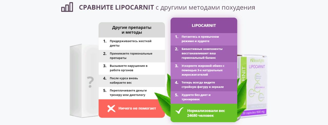 - Lipocarnit улучшает метаболизм, благодаря чему помогает худеть людям, которым не помогли тренажеры и диеты.