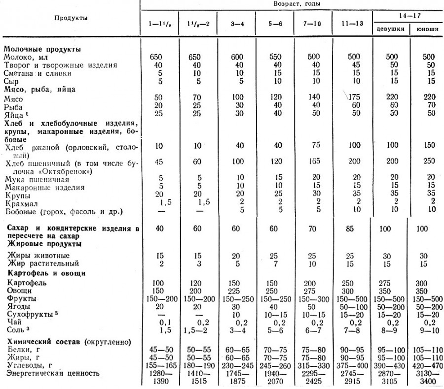 Потребность в энергии (в ккал на 1 кг веса) | 80 (в среднем 2300 ккал в сутки) | 75 (в среднем 2500-2700 ккал в сутки) | 65 (в среднем 2600-3000 ккал в сутки) |