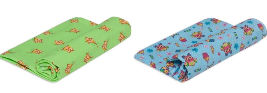 Размеры — 74х74, 120х100 см. Изделия состоят из трех слоев: первый — это микрофлис; второй — промежуточный, впитывает влагу; третий с приятным принтом, который не пропускает влагу.