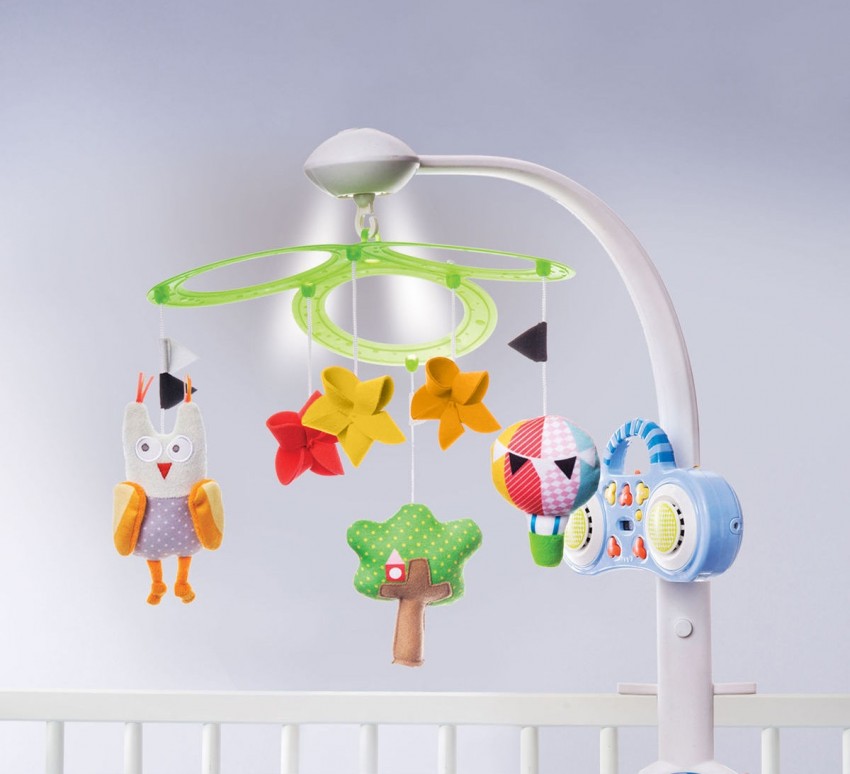 Специальные погремушки со звуковым сопровождением на кроватку подходят для возраста от двух месяцев. Хорошо, если такой мобиль будет дополнен специальным кольцом. Первые разы родные будут заботиться о том, чтобы заводить механизм. А со временем и малыш будет самостоятельно дотягиваться до кольца и заводить себе игрушку.