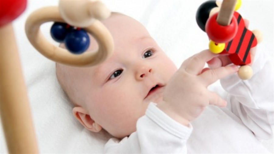 Когда малыш достигает 4-5 месяцев, он может ударять по игрушке-погремушке, которая подвешена перед ним. А также доставать погремушки, которые близко находятся.