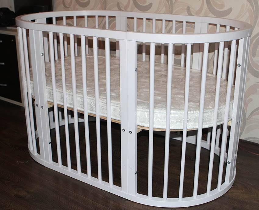 Какой бы ни была модель, основные конструкционные элементы остаются неизменными – передняя, задняя и боковые спинки, дно и ножки. И отталкиваясь от такого «скудного» набора, дизайнеры создали великое множество моделей различных форм и функционала. Сегодня можно без труда отыскать не только традиционные прямоугольные, но и овальные и даже круглые кроватки. Изысканности изделию придают различные декоративные элементы. Насколько это необходимо и удобно – решать потребителю.