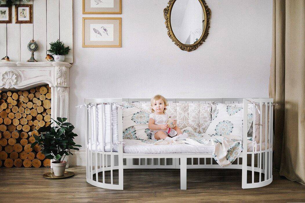 Кровать-трансформер на вырост оснащена раздвижными механизмами, позволяющими увеличить размер спального места. Круглая кровать может трансформироваться в просторный манеж, уютный диванчик, мебельный комплект из столика и 2 стульев, и прочее.