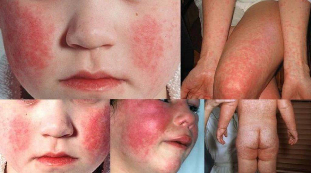Поражение кожных покровов проявляется в виде сыпи на теле ребёнка. Характер этой сыпи может быть разнообразным и имитировать некоторые другие заболевания, что усложняет правильную постановку диагноза. Однако это один из частых симптомов при этом заболевании.