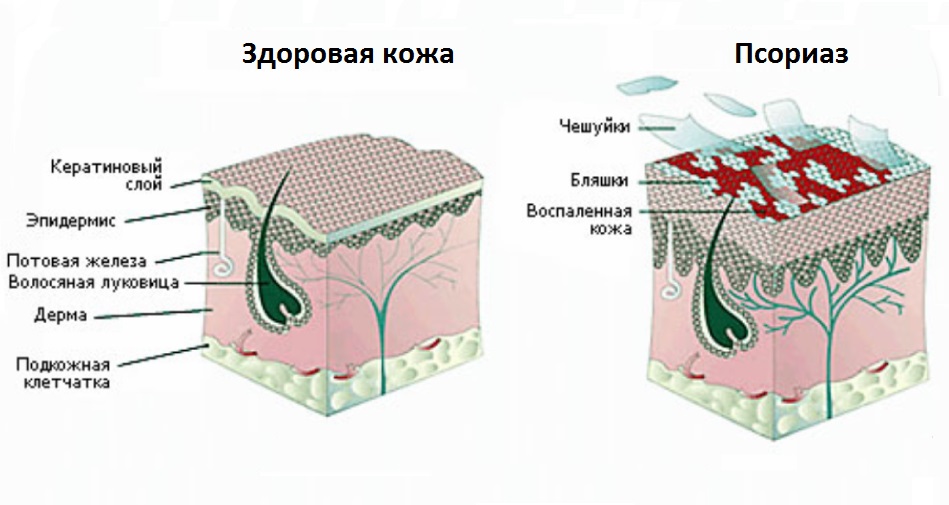 В норме путь кератиноцитов из глубинного (базального) слоя к поверхности эпидермиса занимает около месяца. При псориазе этот процесс значительно ускоряется и составляет в среднем четыре дня. Кожа не может так быстро избавиться от множества ороговевших клеток. В результате возникают видимые уплотнения и чешуйки, характерные для псориаза.