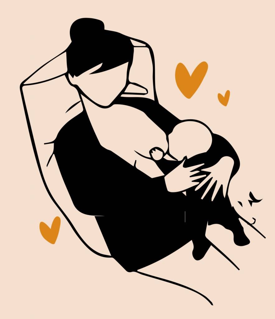 Такое положение поможет маме, и малышу максимально расслабиться и отдохнуть во время кормления. Мама располагается полулежа, с чуть приподнятой головой и плечами, окружив себя удобной опорой из подушек и обеспечивая себе полный комфорт. Ребенок лежит на маме, которая помогает ему найти грудь и приложиться. Кроме того, что расслаблена сама мама, в этом положении прекрасно успокаивается и сам малыш: оно особенно хорошо для беспокойных деток, которые машут ручками и ножками и крутят головкой.