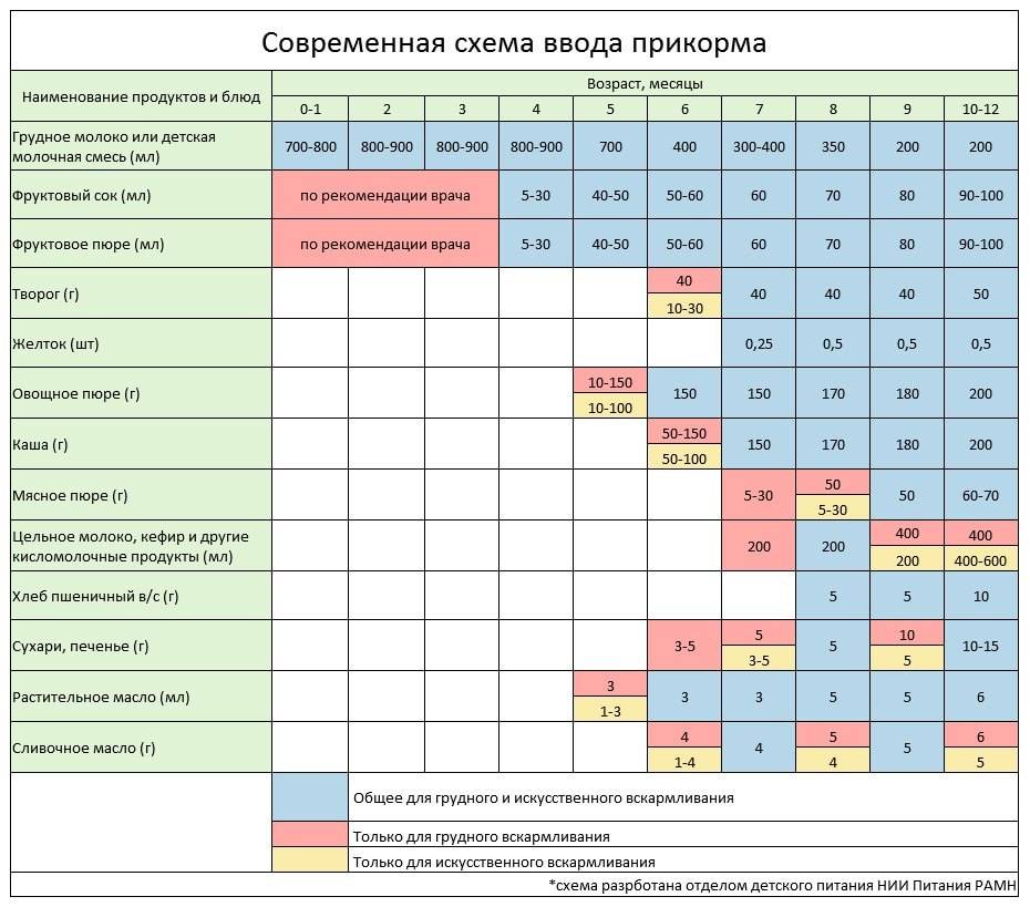 Специальная таблица содержит примерный план кормления и поможет ориентироваться в новом меню малыша.