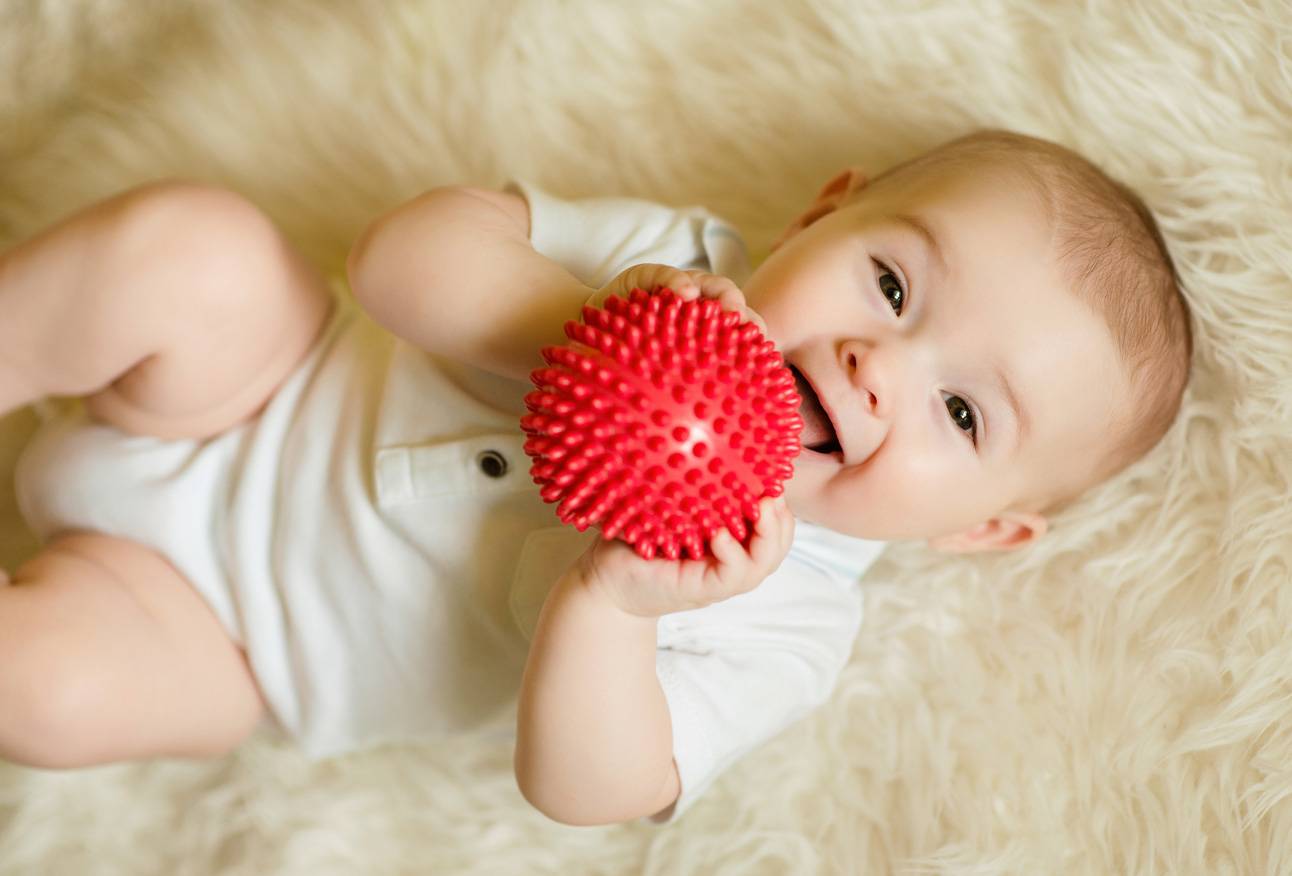 Для укрепления мышц ног и развития координации в кроватке возле ног малыша можно укрепить резиновый мячик. Ребёнок с удовольствием будет его пинать.
