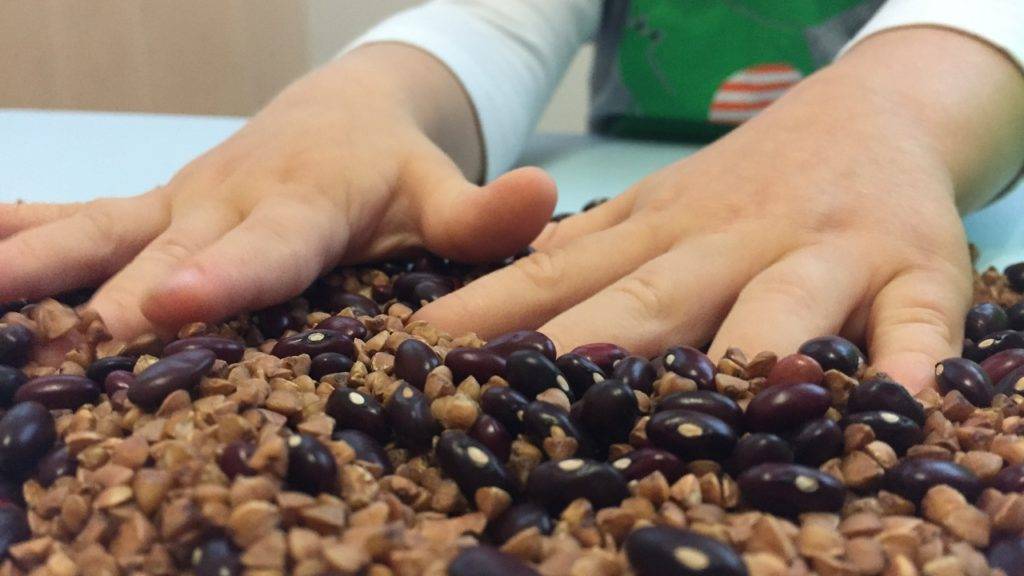 Игры с крупами. Все ту же фасоль и горох ребенку будет интересно перемешать в одной посуде, растереть ладошками.