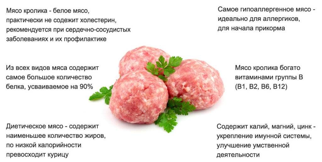 Мясо кролика считается диетическим по ряду причин: оно богато белком, витаминами и микроэлементами, хорошо усваивается, содержит мало жира и в нем практически нет вредного холестерина. Крольчатина практически не вызывает аллергических реакций, поэтому с уверенностью используется в питании деток до года.