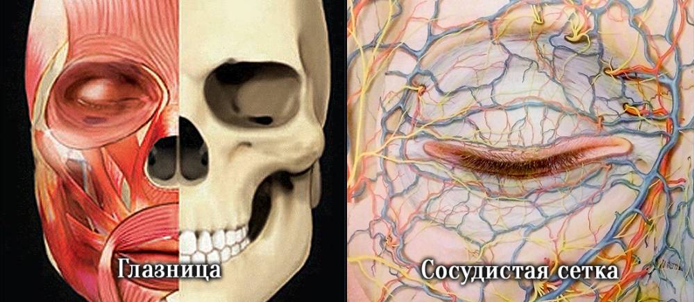 Обратим внимание на глазницу глаза и запомним как много кровеносных сосудов и капилляров в этой области