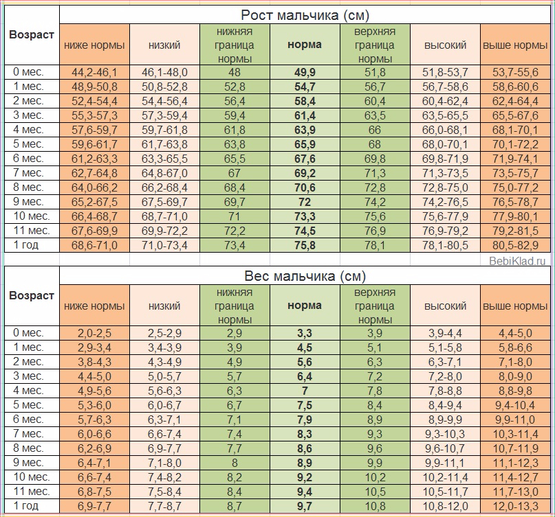От рождения до 6 месяцев малыш должен прибавлять по меньшей мере 18 гр. в день (125 гр. в неделю, 500-550 гр. в месяц). От 7 до 9 месяцев – по меньшей мере 12 гр. в день, а от10 до 12 месяцев – минимум 9 гр. в день