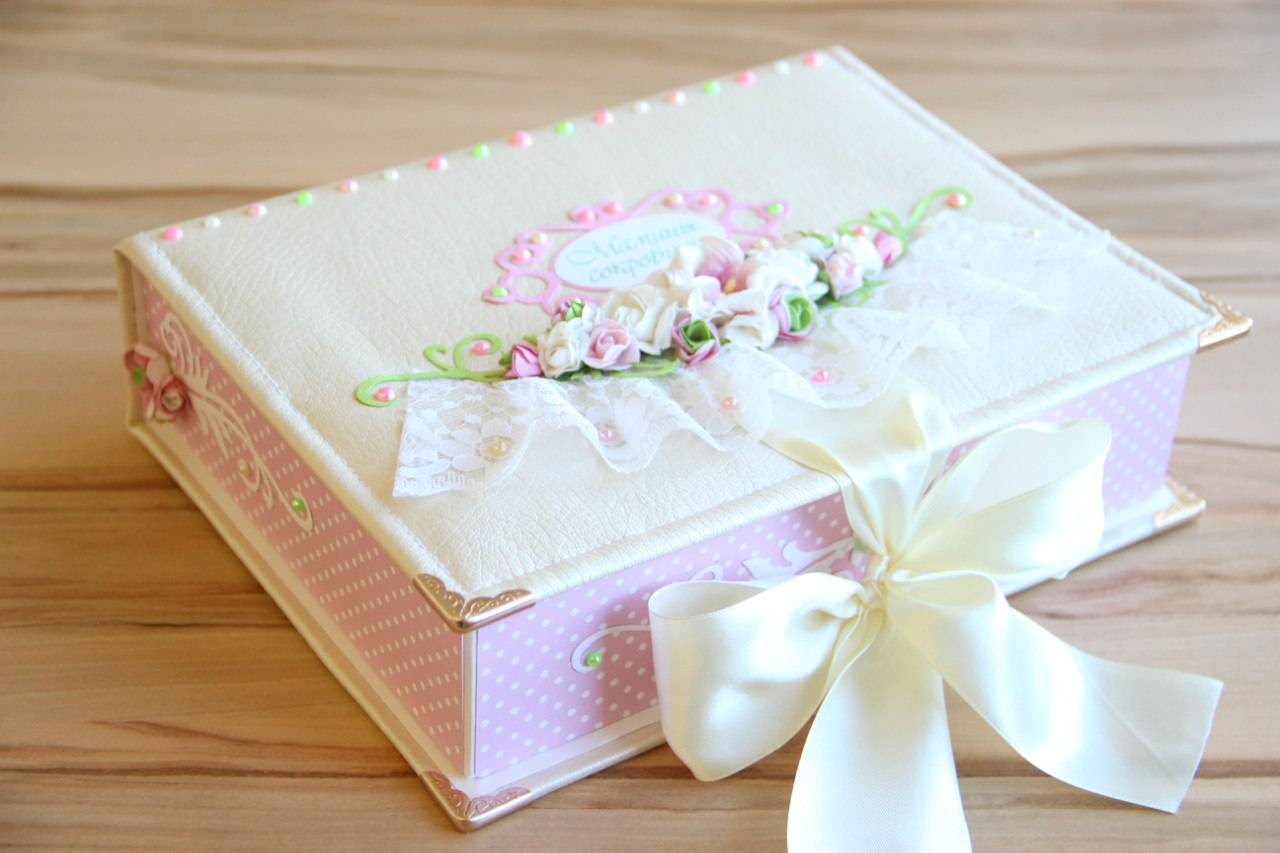 - Альбом для фотографий, выполненный под заказ в технике скрапбукинг. В создании таких альбомов используется специальная дизайнерская бумага, ткань, разные элементы декора (цветы, бусины, стразы). Созданный руками талантливого мастера, такой альбом становится настоящим произведением искусства и предметом декора. Сертификат на фотосессию новорожденной тоже станет отличным презентом.