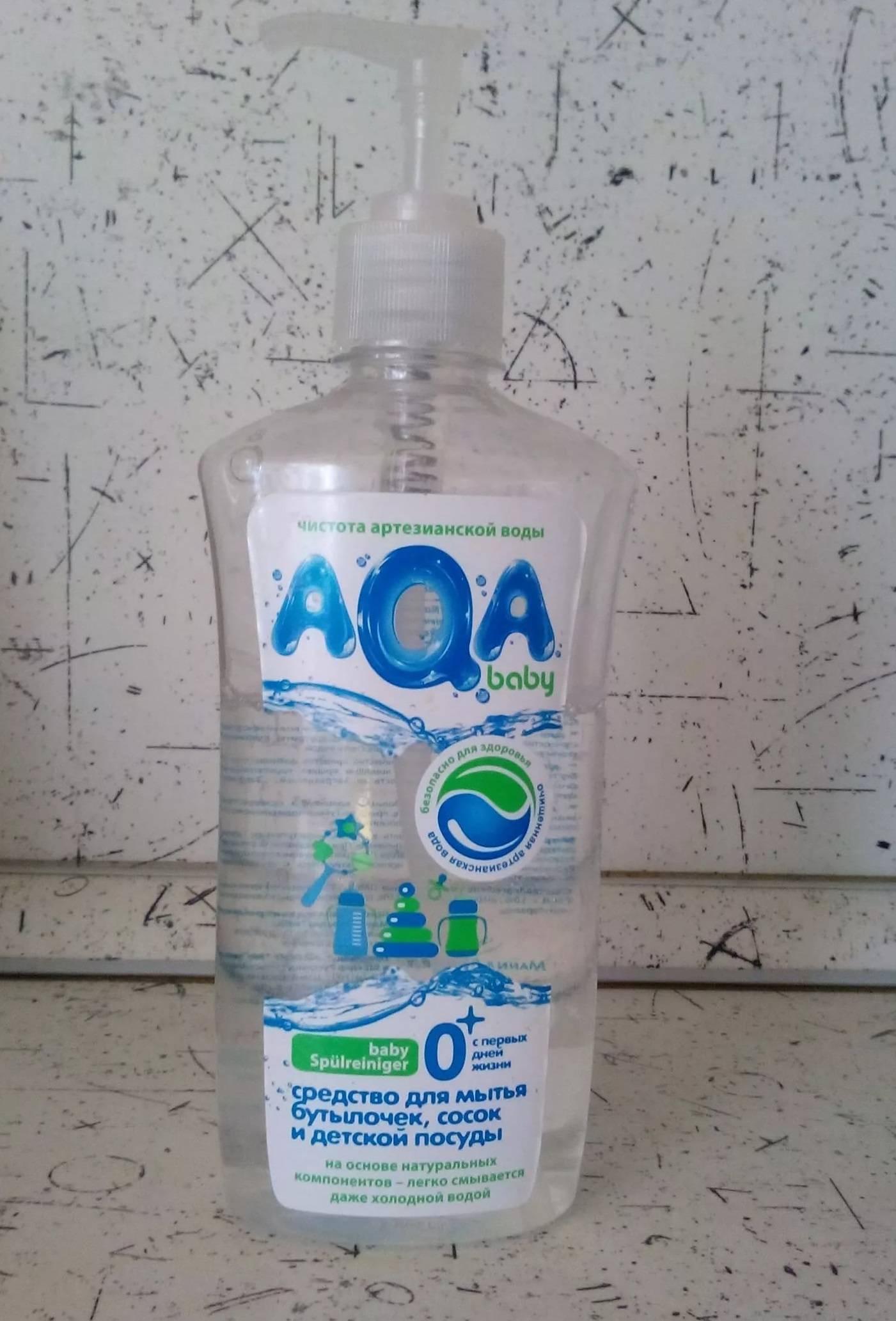 - AQA baby — продукт отечественного производства, быстро и легко смывается, не «задерживаясь» на посуде. Им допускается мыть продукты (овощи, фрукты). Не содержит формальдегидов, фосфатов, красителей, не вызывает аллергии. В то же время не рекомендуется использовать его для младенцев возрастом до полугода.